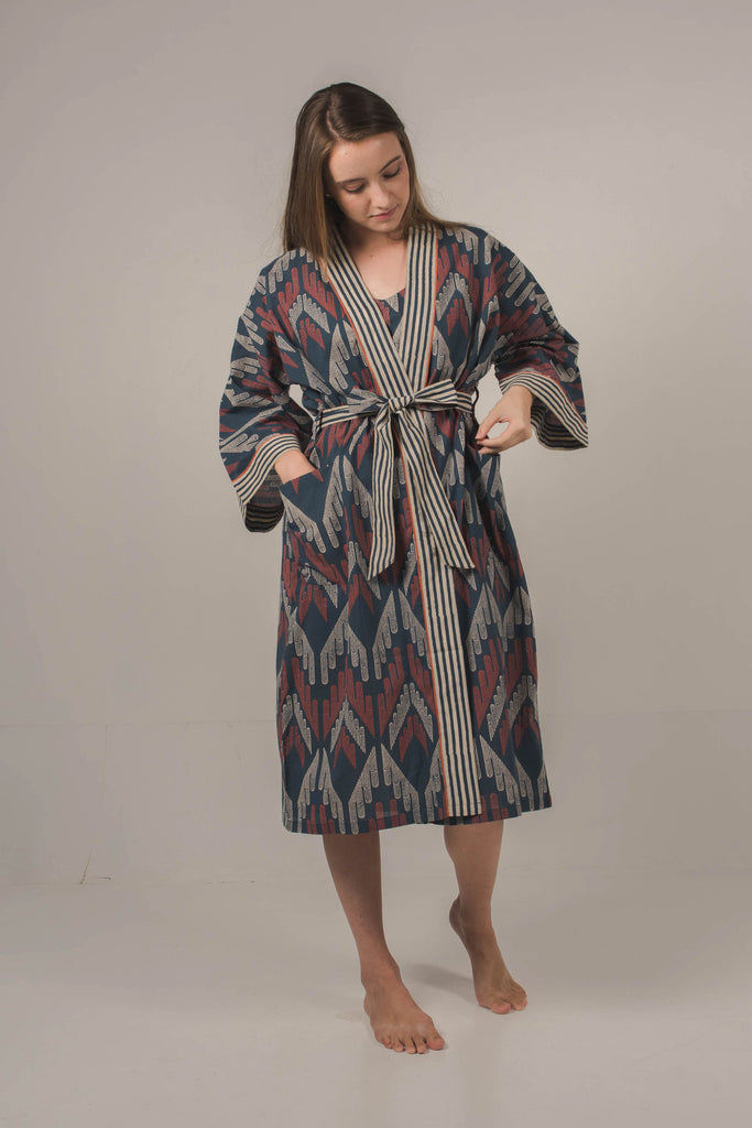 Inspired by the geometric sun-shading fins of Furama City Centre, an art-deco building in Singapore, the Façade print is a love of all things architectural. Designed from scratch and carved on wood blocks, then carefully hand-printed on 100% organic cotton by artisans. All the colours used are eco-friendly and azo-free – gentle on the skin and kind to the planet. Feel at home in the dusky navy with geometric, fluid lines of rust red and cream.