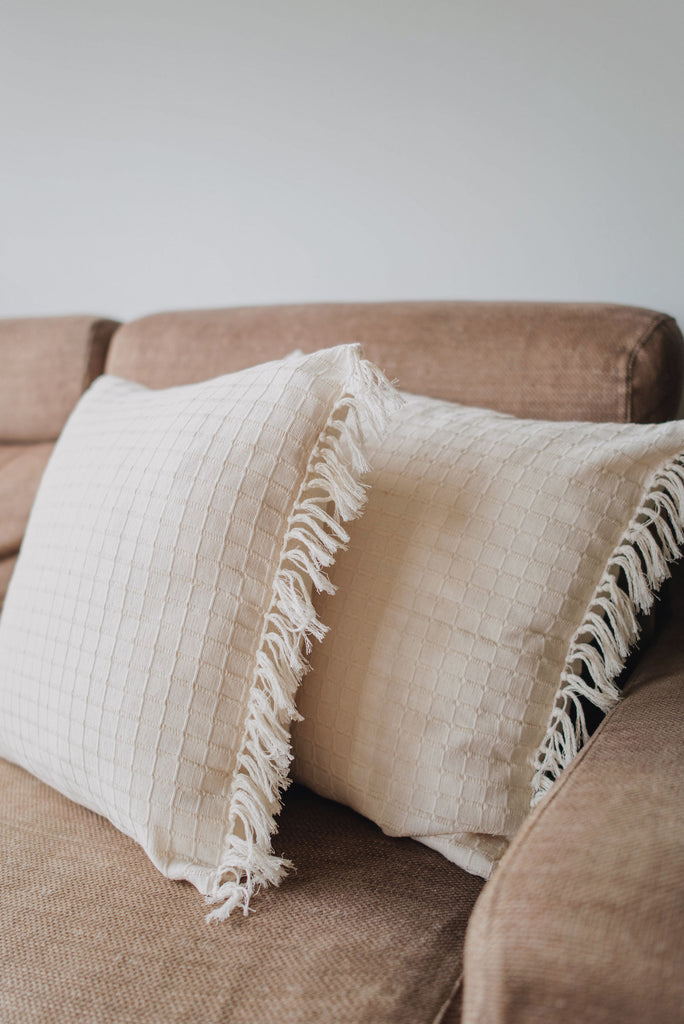 Cushion covers inspired by the simple origins of architectural composition - grids. Handwoven by our artisans on a step loom, this 100% cotton cover features subtle raised ridges and playful side fringes.